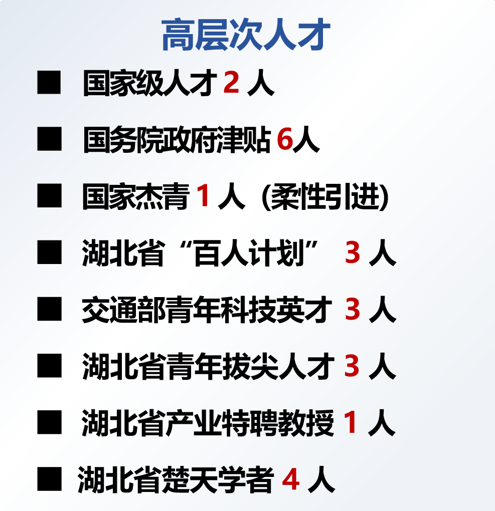 学院现有教职工230人,其中专职教师166人,其中教授51人,副教授69人。国家青年拔尖人才1人,享受国务院政府特殊津贴6人,交通部青年科技英才3人,湖北省“百人计划”3人,湖北省青年拔尖人才3人,楚天学者4人,楚天学子1人,中国科协青年人才托举工程1人,武汉英才5人,产学研特聘责任专家2人,校一流专业责任教授1人,校科技创新人才5人,校青年拔尖人才第二层次1人。